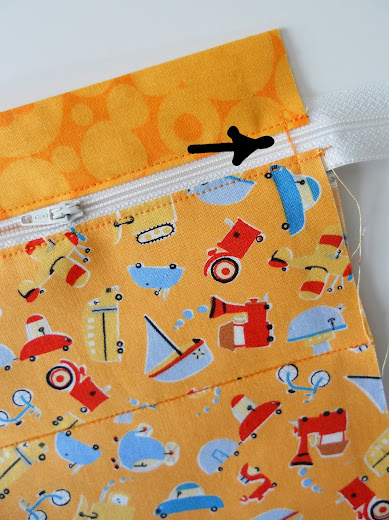 Finishing Zipper: Bring tab of zipper to the middle of the wallet and stitch over the ends of the zipper 1/4" from the edge of wallet side on both sides.